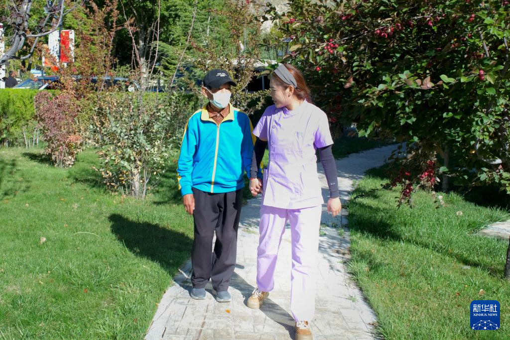 在西藏自治區(qū)殘疾人托養(yǎng)服務(wù)中心,護理主管德吉(右一)帶著拉瑪散步(9月23日攝)。新華社記者周昱龍 攝