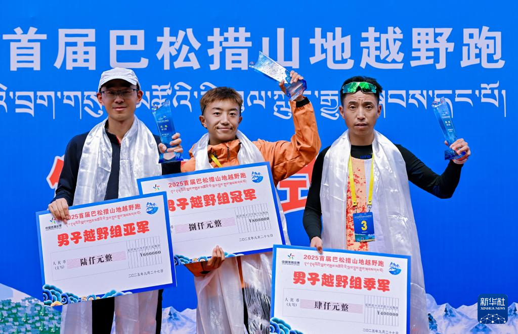 9月27日,30公里越野男子組冠軍桑珠(中)、亞軍侯華斌(左)和季軍普布頓珠在頒獎(jiǎng)儀式上。新華社發(fā)