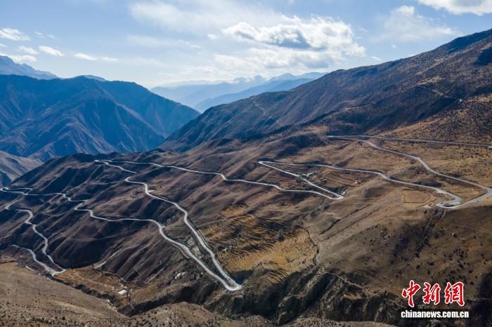 2023年1月16日,川藏公路西藏昌都段著名的“天路72拐”,該路段以高海拔、急彎、大落差等復(fù)雜驚險路況被人熟知。(無人機畫面)中新社記者 江飛波 攝