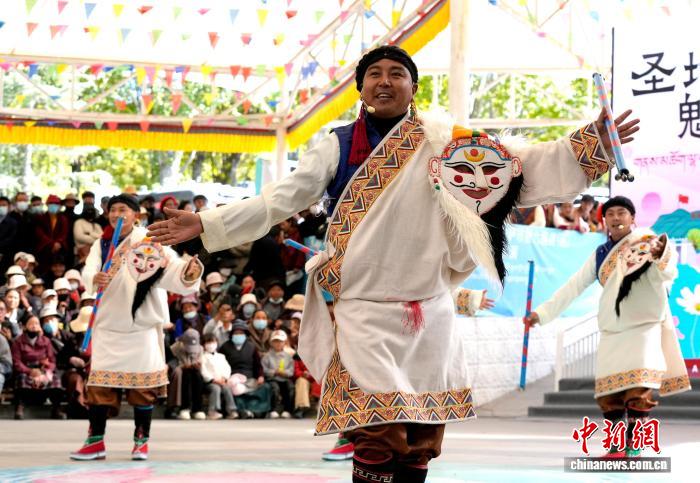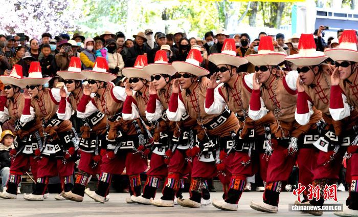 10月19日,“格?;ū崩_市第六屆縣(區(qū))藝術(shù)團(tuán)文藝調(diào)演頒獎(jiǎng)活動(dòng)在布達(dá)拉宮腳下的宗角祿康公園舉行。現(xiàn)場,拉薩市各縣(區(qū))藝術(shù)團(tuán)帶來精彩節(jié)目。圖為文藝調(diào)演頒獎(jiǎng)活動(dòng)上的文藝表演。中新社記者 李林 攝