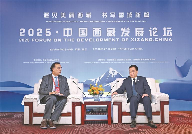 10月28日,自治區(qū)黨委書記王君正在林芝會(huì)見參加2025·中國(guó)西藏發(fā)展論壇的外國(guó)政要和駐華使節(jié)。這是王君正會(huì)見聯(lián)合國(guó)秘書長(zhǎng)古特雷斯先生的代表,聯(lián)合國(guó)教科文組織駐華代表、東亞辦事處主任兼代表夏澤翰。本報(bào)記者 旦增西旦 攝