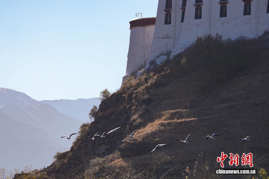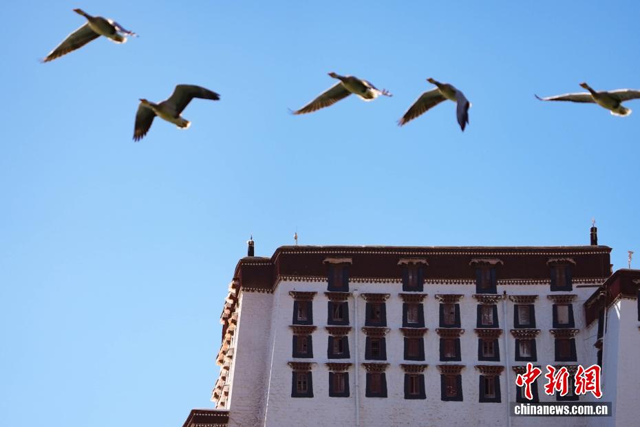 11月17日,西藏拉薩迎來(lái)大批越冬候鳥(niǎo)。拉薩河、宗角祿康公園等地,成為了它們的棲息天堂。在宗角祿康公園內(nèi),赤麻鴨、斑頭雁成群結(jié)隊(duì),時(shí)而低頭覓食,時(shí)而水中嬉戲。它們的身影引得市民和游客紛紛駐足觀賞、拍照留念,構(gòu)成了一幅人與自然和諧共生的美麗畫(huà)卷。圖為斑頭雁與布達(dá)拉宮同框。貢確 攝