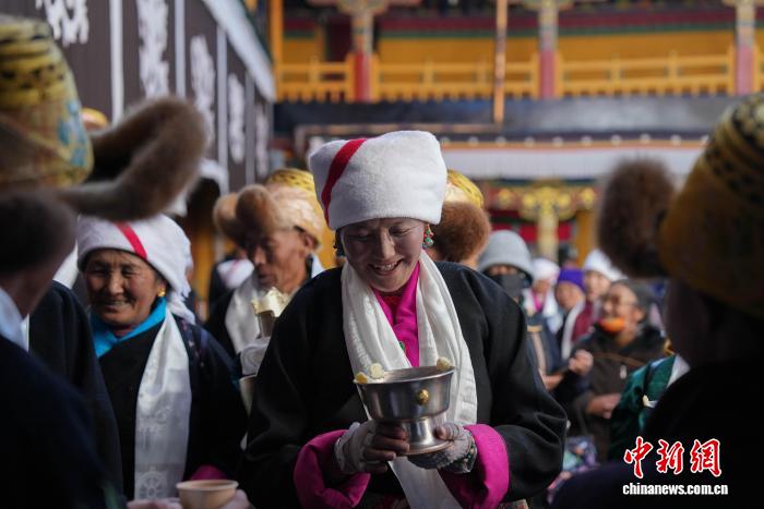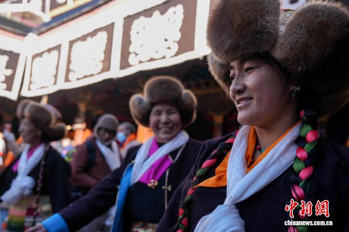 11月28日,隨著藏歷十月十五白拉姆節(jié)臨近,連日來,拉薩及周邊信眾身著色彩艷麗的藏裝節(jié)日盛裝,手持從家中精心準(zhǔn)備的頭等青稞酒、新收的青稞及新鮮水果,陸續(xù)前往大昭寺、色拉寺、哲蚌寺等寺廟朝拜祈福。大昭寺內(nèi),信眾敬獻(xiàn)供品后載歌載舞,歌聲悠揚(yáng)、舞步輕快,盡顯節(jié)日喜悅。白拉姆節(jié)又稱 “仙女節(jié)”。相傳,白拉姆是拉薩地區(qū)的保護(hù)神,是藏傳佛教最高護(hù)法神之一班丹拉姆的女兒。白拉姆曾與大昭寺護(hù)法神赤尊贊相互愛慕并私定終身,其母親班丹拉姆發(fā)現(xiàn)后,赤尊贊被趕到拉薩河南岸,每逢藏歷十月十五日,二人才能隔河相見一次。圖為白拉姆節(jié)臨近之際,信眾在大昭寺內(nèi)敬獻(xiàn)供品后載歌載舞的場景。貢確 攝