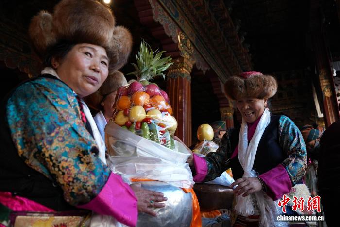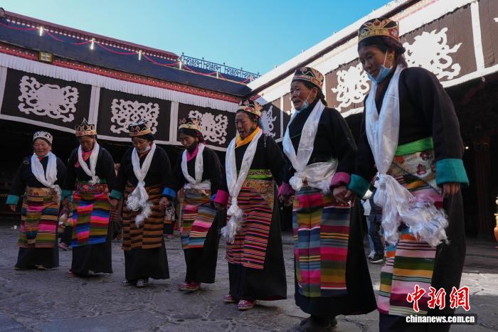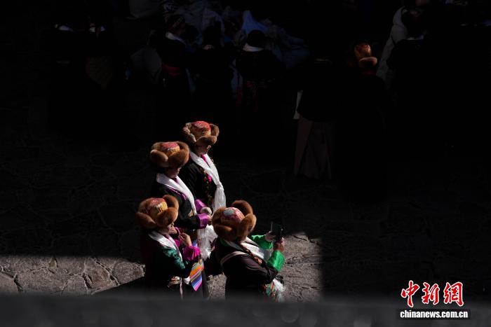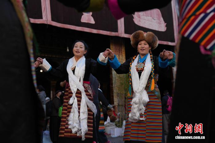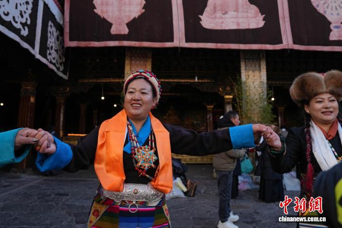 圖為白拉姆節(jié)臨近之際,信眾在大昭寺內(nèi)敬獻(xiàn)供品后載歌載舞的場景。貢確 攝