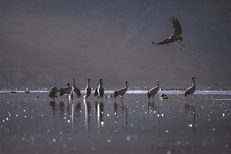 來到卡孜水庫,只見水面上薄霧未散,黑頸鶴的鳴叫聲劃破靜謐,那聲音清亮卻不刺耳,像帶著高原特有的通透感,時(shí)而短促清脆伴著水波蕩漾的輕響,似乎在訴說著高原的故事。循聲望去,幾只黑頸鶴正在湖面上悠然佇立,修長(zhǎng)的脖頸微微彎曲,倒映在平靜的水面上,宛如水墨畫卷中的靈動(dòng)筆觸;忽然間,幾只黑頸鶴率先舒展雙翼,寬大的翅膀劃破晨霧,腳掌蹬離水面時(shí)濺起細(xì)碎的水花,身姿矯健地朝著高空飛去,其余黑頸鶴也相繼展翅,追隨同伴的身影扶搖而上,朝著村落方向飛去。當(dāng)它們從錯(cuò)落有致的村民住房上空掠過時(shí),晨光恰好穿透薄霧,灑在灰褐色的羽翼上,下方屋頂升起裊裊炊煙,動(dòng)靜之間,勾勒出一幅人與自然和諧共生的鮮活圖景。