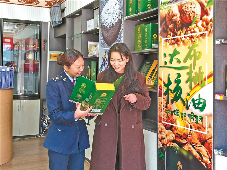 企業(yè)工作人員向稅務(wù)人員介紹核桃油。記者 袁海霞 攝