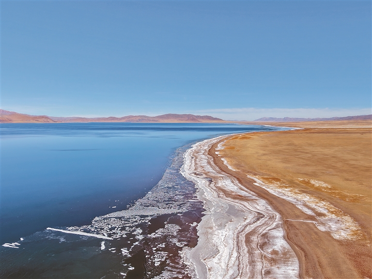 回到車上,身體漸漸暖和起來(lái)。車窗外,色林錯(cuò)在夕照下變幻著色彩:近岸的浪花凍結(jié)成層層疊疊的冰凌;遠(yuǎn)處的湖面仍泛著深藍(lán)的波光,與天際線融為一體。