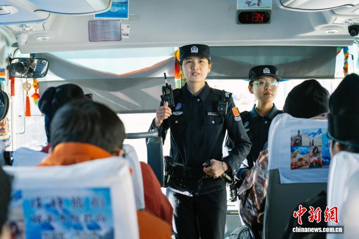 圖為12月24日,西藏出入境邊防檢查總站珠峰邊境派出所移民管理警察在前往珠峰大本營景區(qū)的巴車上向游客宣講安全事項。蔣美靈 攝