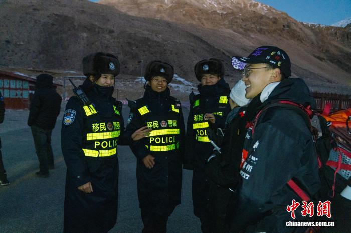 圖為12月24日,西藏出入境邊防檢查總站珠峰邊境派出所移民管理警察在珠峰大本營景區(qū)與游客交流,并交待安全事項。蔣美靈 攝
