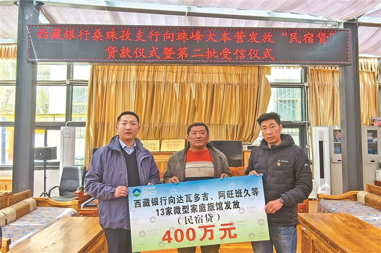 圖為西藏銀行向珠峰大本營(yíng)13家微型家庭旅館發(fā)放“民宿貸”貸款。