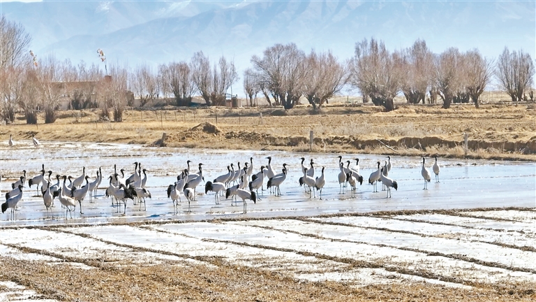 “每年10月底開(kāi)始,黑頸鶴就從北方飛來(lái)越冬?!毖沧o(hù)員嘎旦仁增告訴記者,“這幾年保護(hù)力度加大,棲息環(huán)境更好了,來(lái)過(guò)冬的黑頸鶴一年比一年多。”
