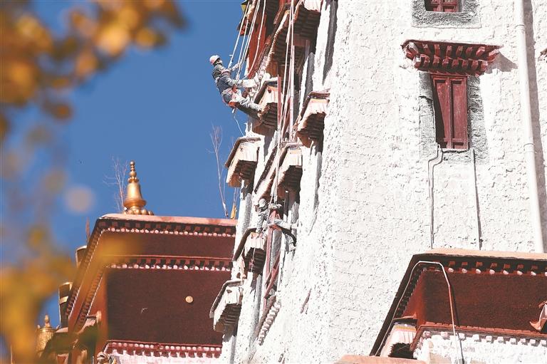 10月22日,拉薩布達(dá)拉宮迎來一年一度的粉刷季,人們手持工具,將涂料逐層涂刷在布達(dá)拉宮墻上。據(jù)了解,布達(dá)拉宮刷墻涂料主要以白灰、紅土和黃土等天然原料為主,為了增加光澤和黏度,調(diào)配過程中還會(huì)添加少量的牛奶、白糖、蜂蜜、藏紅花和牛骨膠等,讓涂料更好地附著在墻體上,為布達(dá)拉宮的墻體增添一層保護(hù)。記者 洛桑 唐斌 攝影報(bào)道