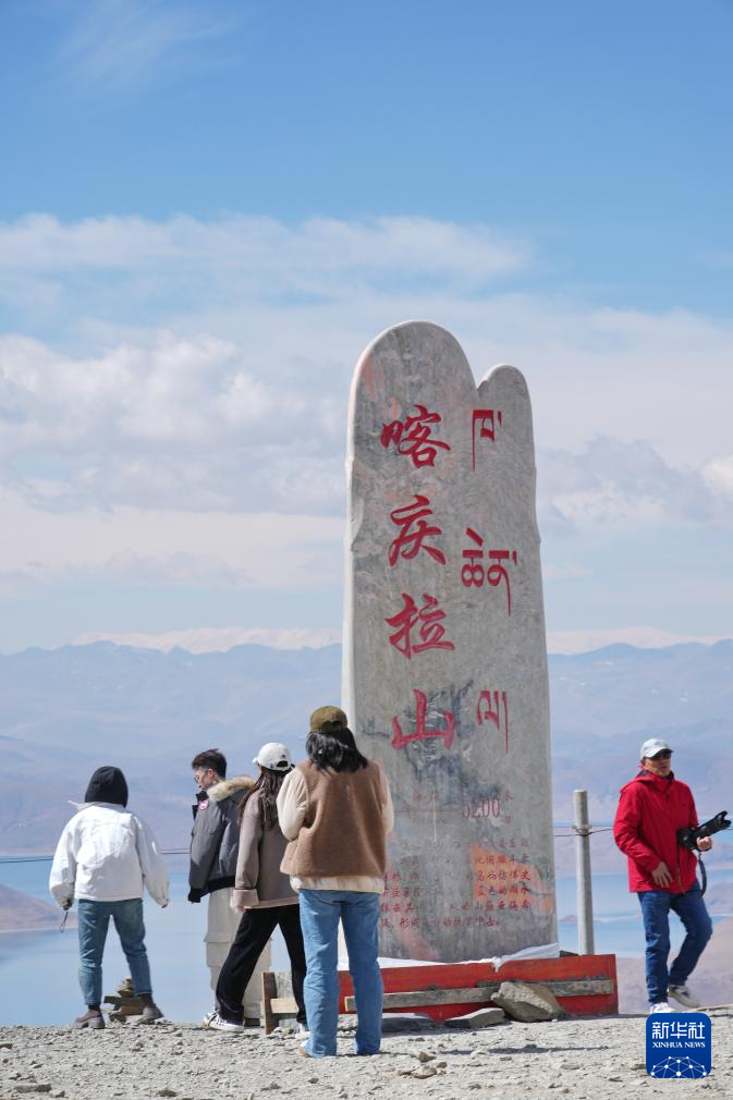 游客在喀慶拉山上俯瞰羊卓雍錯(4月5日攝)。新華社記者 張汝鋒 攝