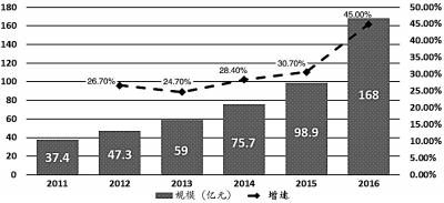 表:2011—2016我國(guó)大數(shù)據(jù)交易市場(chǎng)規(guī)模及增速 數(shù)據(jù)來(lái)源:易觀國(guó)際數(shù)據(jù)