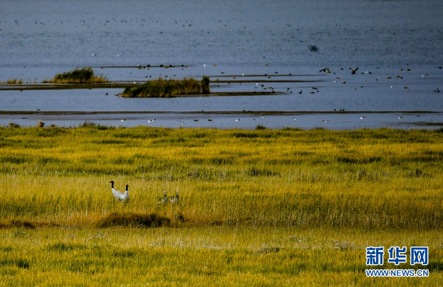 烏蘭縣都蘭湖國(guó)家濕地公園里,四只黑頸鶴挺立著。
