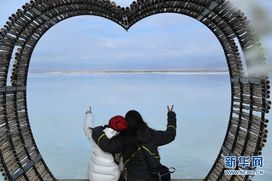 兩位游客在茶卡鹽湖內(nèi)拍照。新華網(wǎng) 潘彬彬攝