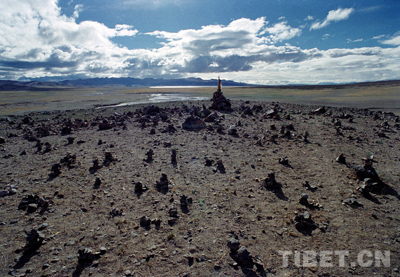 這是遼闊的藏北高原。前景是信教群眾用小石塊壘起的一個(gè)個(gè)祭天神的小石堆(唐召明1998年攝)