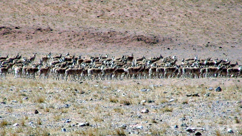 這是羌塘國(guó)家級(jí)自然保護(hù)區(qū)正在遷徙中的國(guó)家一級(jí)保護(hù)動(dòng)物藏羚羊中的雌性藏羚羊(唐召明2006年攝)