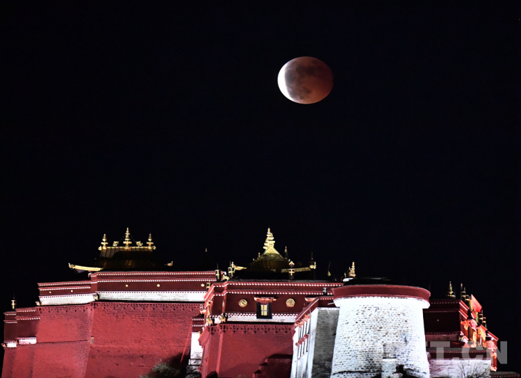 中國西藏網(wǎng)訊 11月8日晚,天宇上演精彩月全食,我國絕大部分地區(qū)都可以看到全食的“紅月亮”階段。圖為拉薩上空的“紅月亮” 攝影:覺果