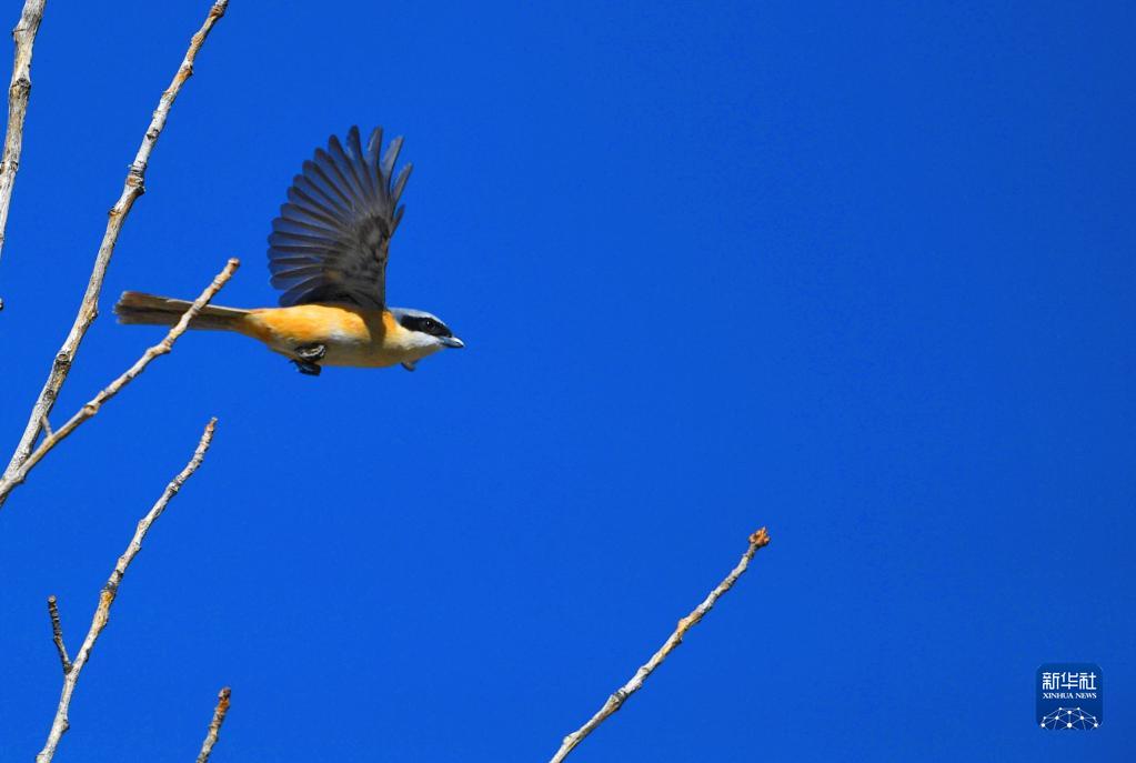 灰背伯勞在拉薩市城關(guān)區(qū)蔡公堂街道次角林村上空飛過(guò)(5月14日攝)。新華社記者 張汝鋒 攝