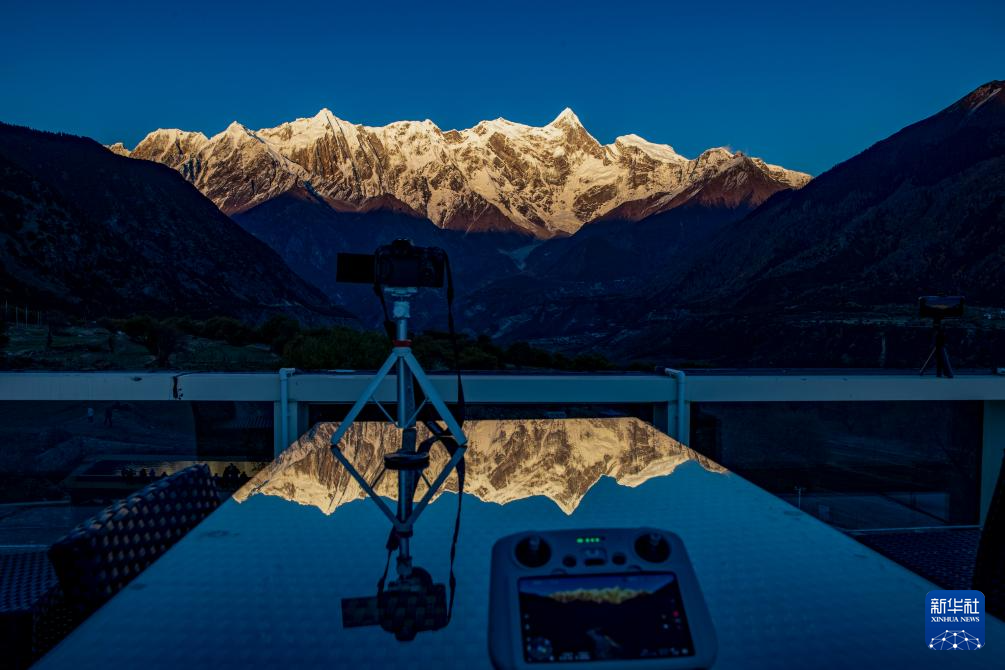 攝影愛好者在索松村一家酒店樓頂拍攝日落時分的南迦巴瓦峰(11月13日攝)。新華社記者 姜帆 攝