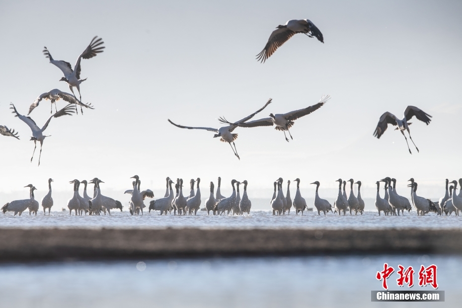 11月19日晨,西藏拉薩林周縣黑頸鶴保護區(qū)內(nèi),黑頸鶴覓食、嬉戲。拉薩北部的林周縣平均海拔約4200米,是黑頸鶴的主要越冬地之一。目前,到林周縣越冬的黑頸鶴已達2000只左右。