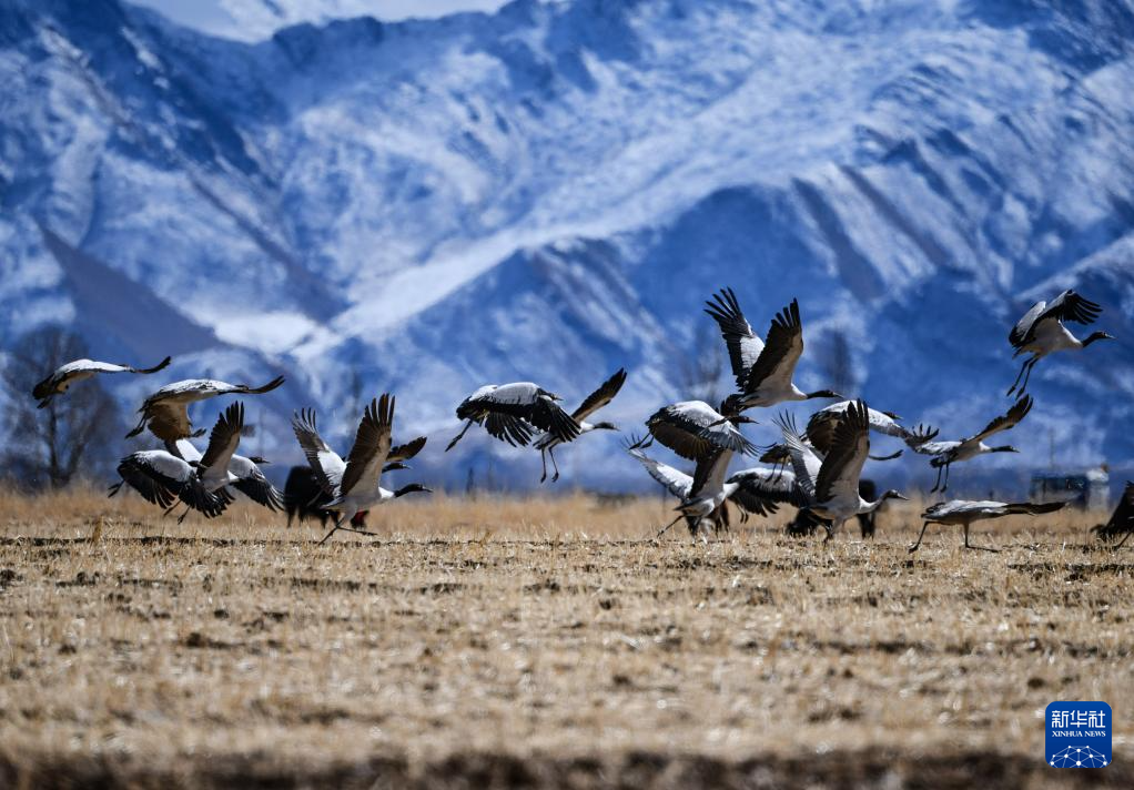 12月8日拍攝的拉薩市林周縣境內(nèi)田野間飛翔的黑頸鶴。新華社記者 晉美多吉 攝