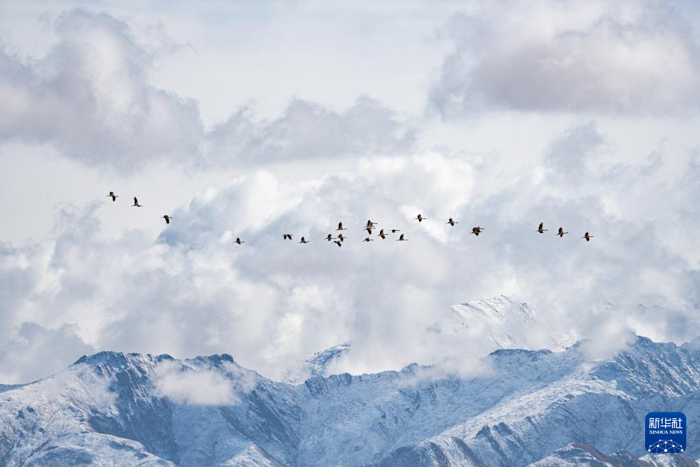 12月8日拍攝的拉薩市林周縣境內(nèi)雪山前飛翔的黑頸鶴。新華社記者 晉美多吉 攝
