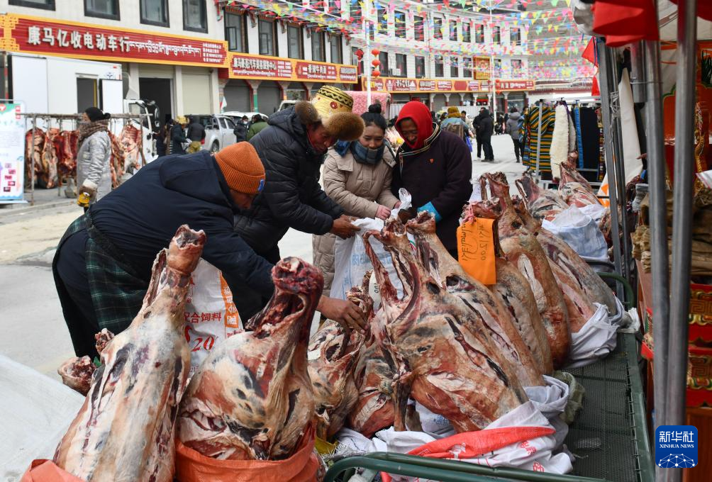 12月13日,在西藏日喀則市康馬縣冬季物資文化交流會上,當地群眾在購買羊肉。新華社記者格桑朗杰 攝