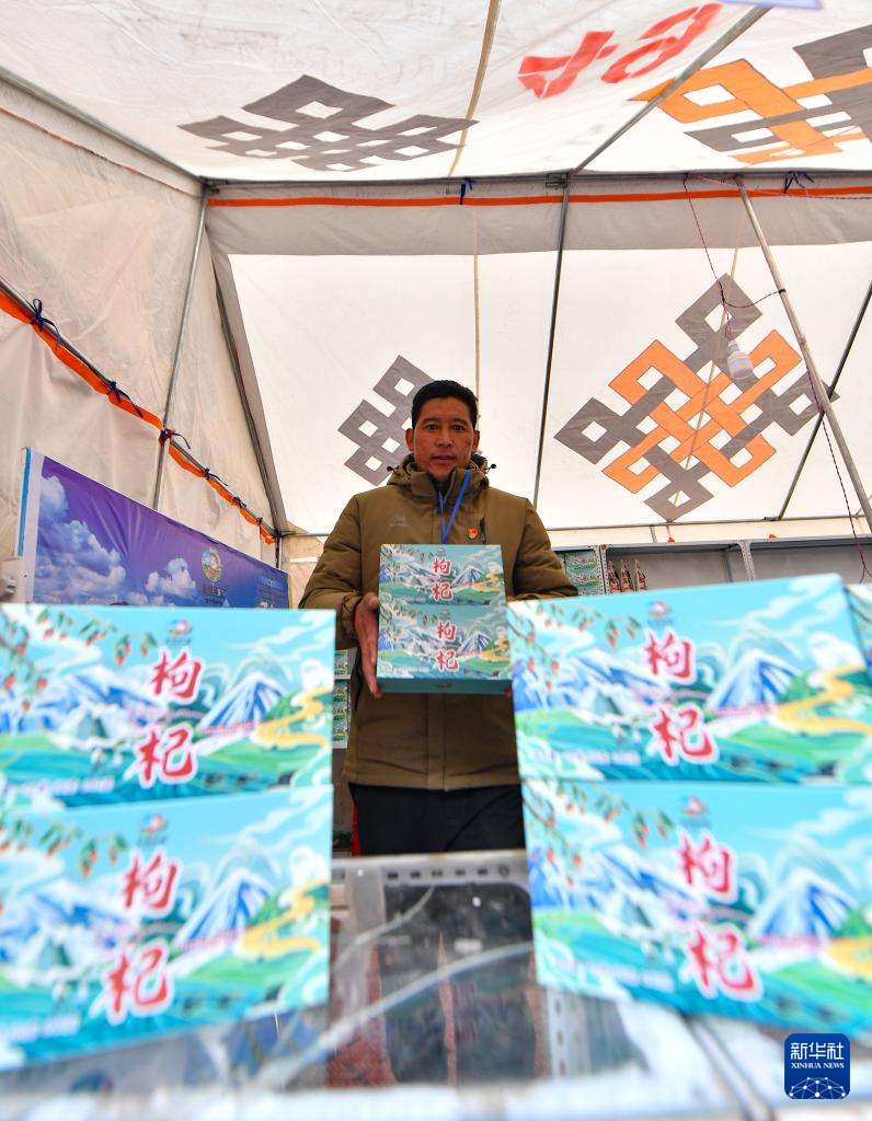 12月13日,在西藏日喀則市康馬縣冬季物資文化交流會上,涅如麥鄉(xiāng)群眾展示自產的枸杞。新華社記者晉美多吉 攝