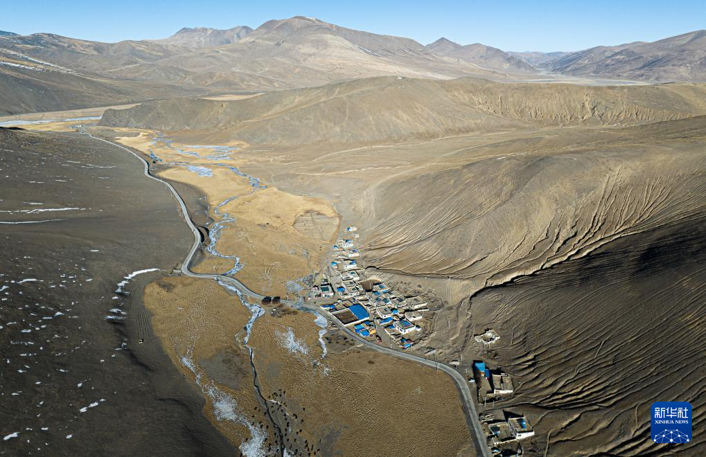 坐落于群山間的日喀則市白朗縣東喜鄉(xiāng)思古龍村(1月13日攝,無人機照片)。新華社發(fā)(丁增尼達(dá) 攝)