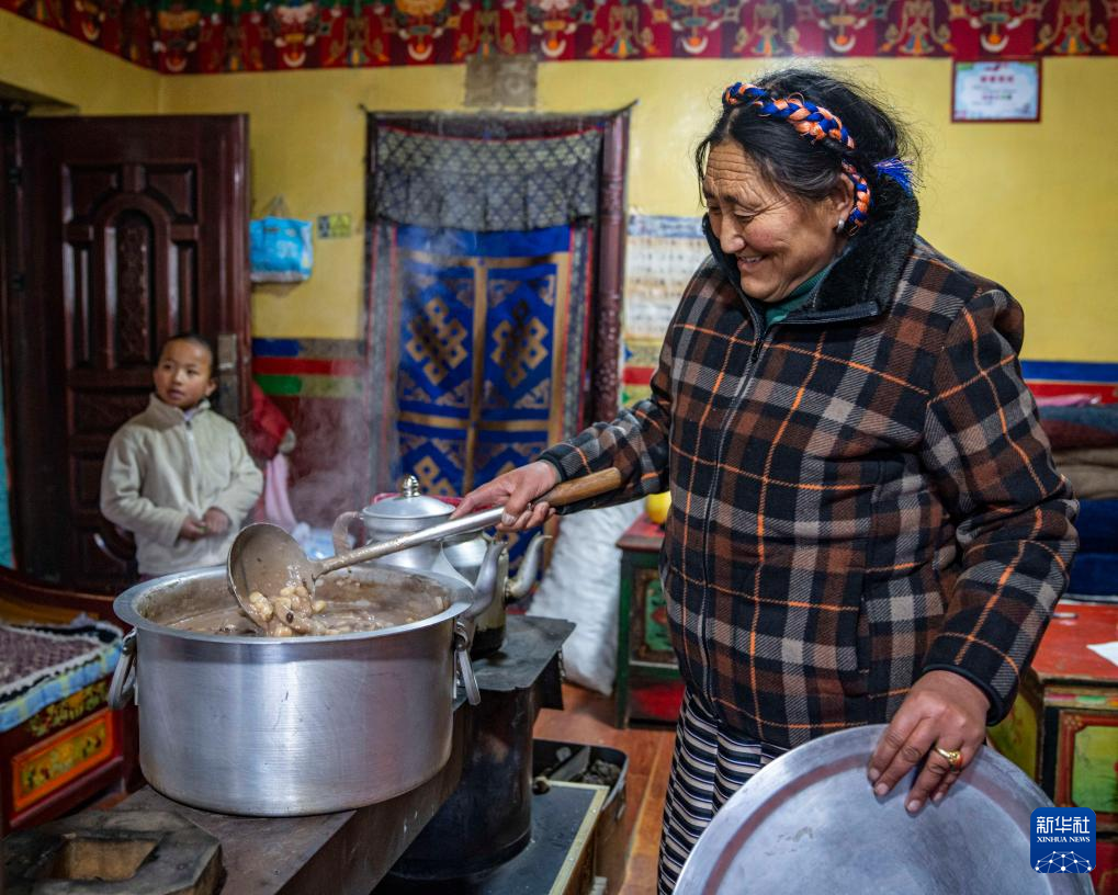 在位于西藏拉薩市當(dāng)雄縣公塘鄉(xiāng)甲根村的家中,斯曲旺姆的兒子索朗羅達(dá)為母親端上“古突”(2月8日攝)。新華社記者 孫非 攝 ??