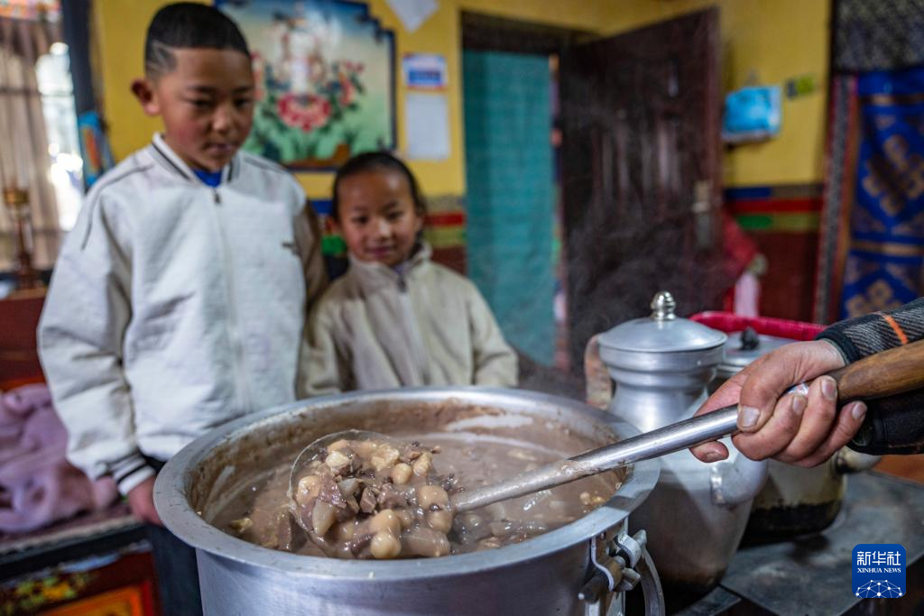 在位于西藏拉薩市當(dāng)雄縣公塘鄉(xiāng)甲根村的家中,斯曲旺姆的重孫子和重孫女在等待“古突”上桌(2月8日攝)。新華社記者 孫非 攝 ??