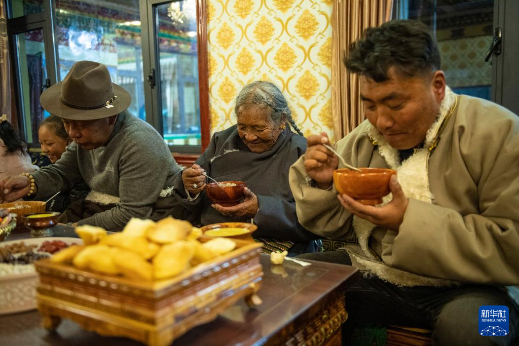 在西藏拉薩市當(dāng)雄縣公塘鄉(xiāng)甲根村,整個(gè)村子沉浸在節(jié)日氣氛中。村里的斯曲旺姆老人家四世同堂,房屋寬敞明亮。手里捧著盛滿(mǎn)“古突”的木碗,斯曲旺姆老人希望這樣的幸福能長(zhǎng)長(zhǎng)久久?! ??