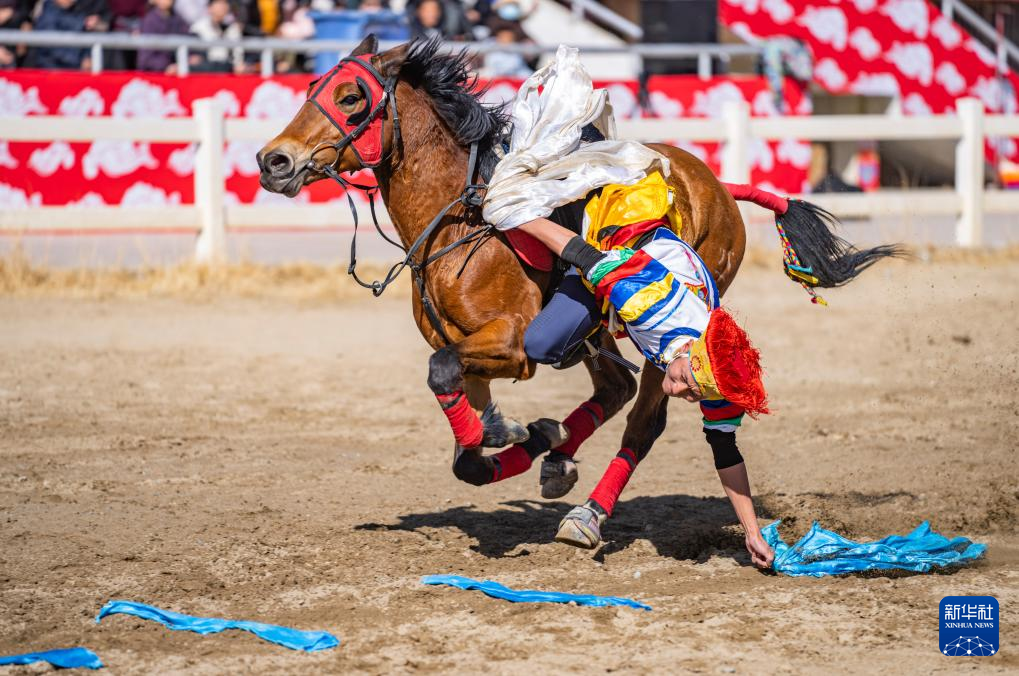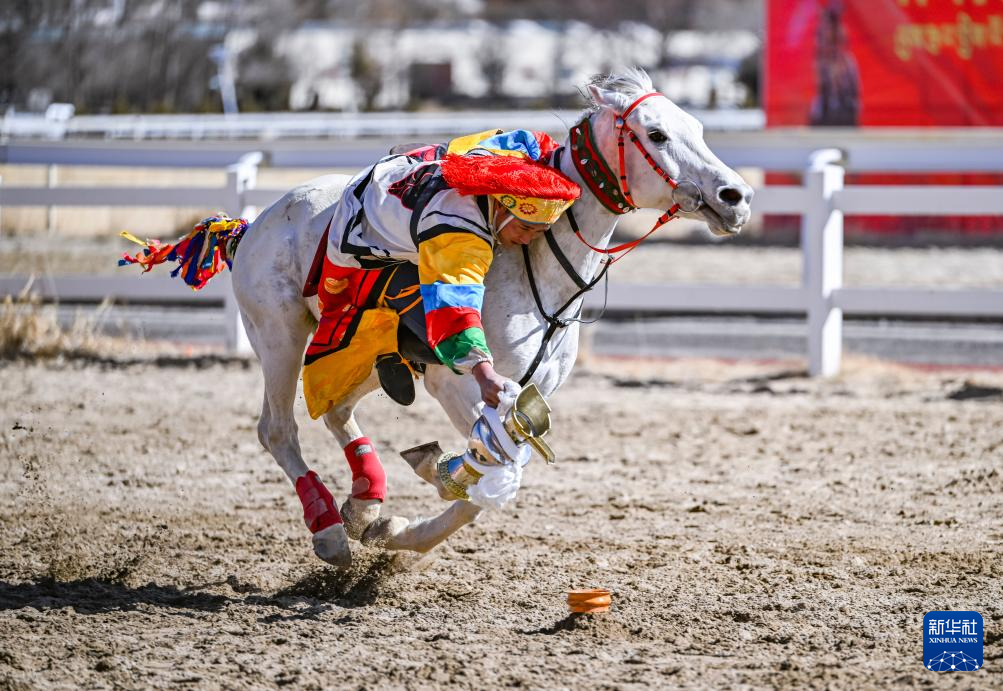 在拉薩賽馬場(chǎng),騎手表演馬上拾哈達(dá)(2月12日攝)。新華社記者 孫非 攝 ??