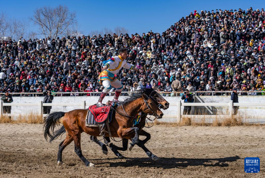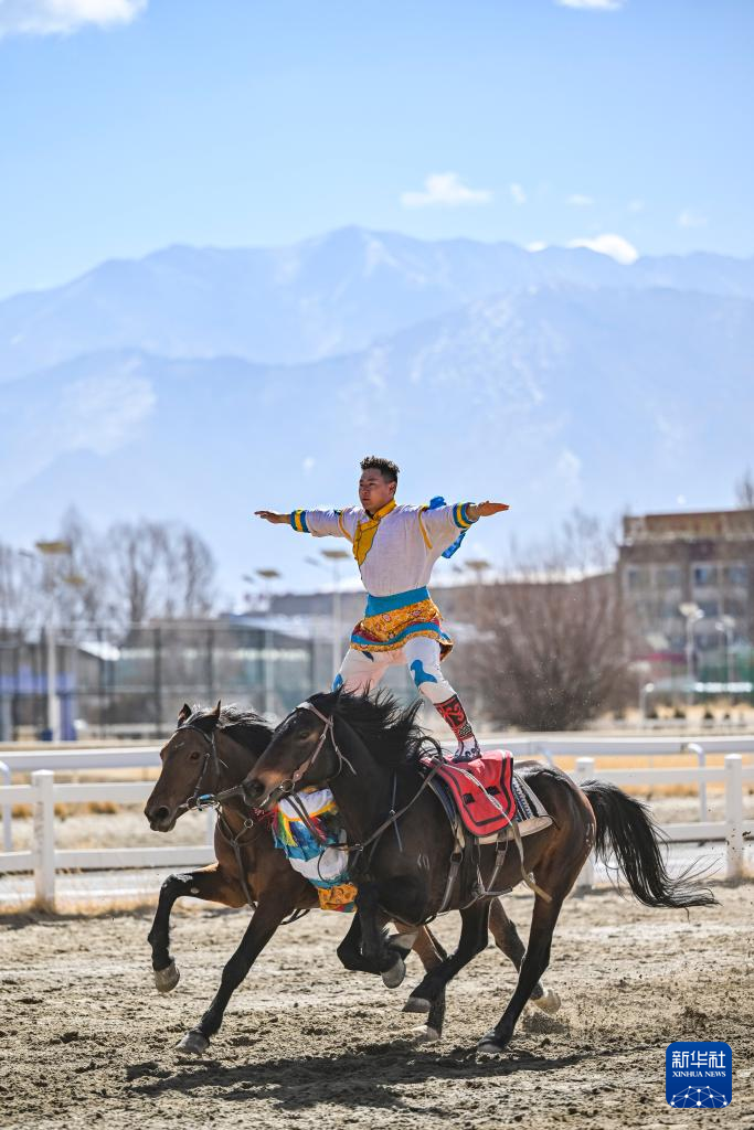 在拉薩賽馬場(chǎng),騎手進(jìn)行雙馬單人表演(2月12日攝)。新華社記者 孫瑞博 攝 ??