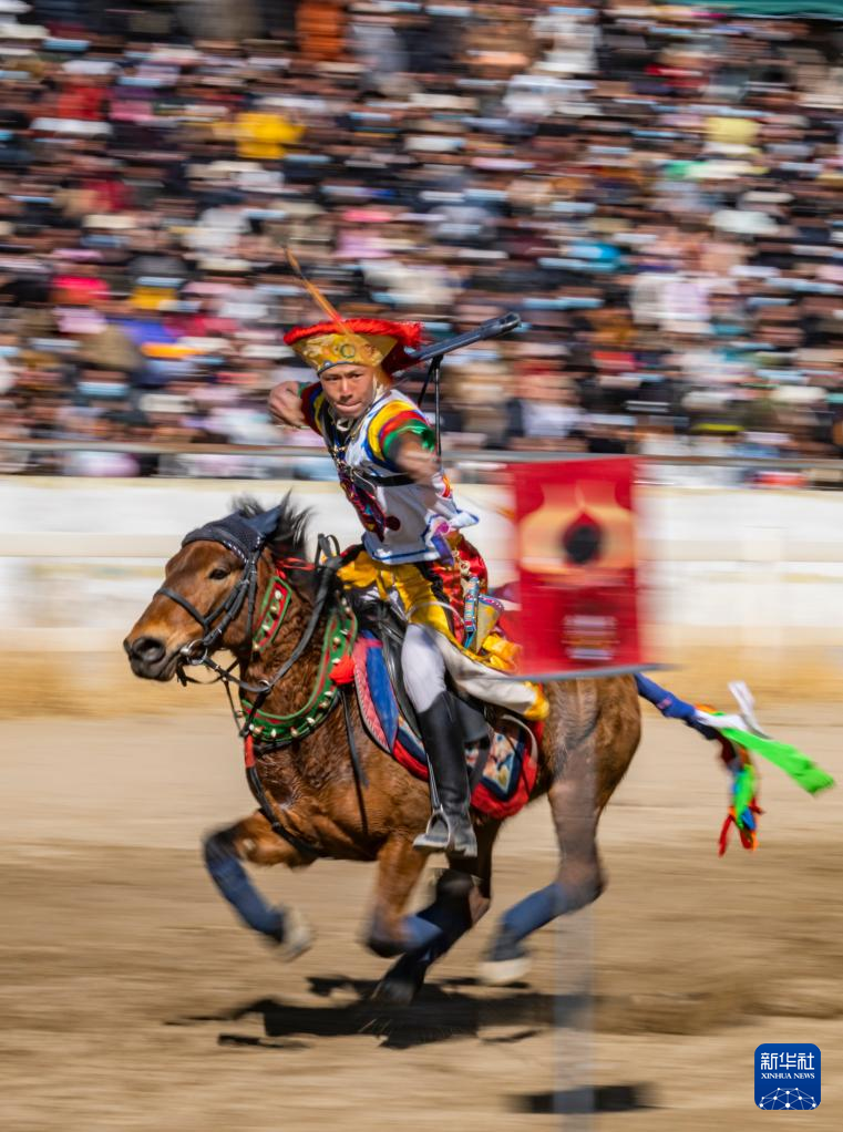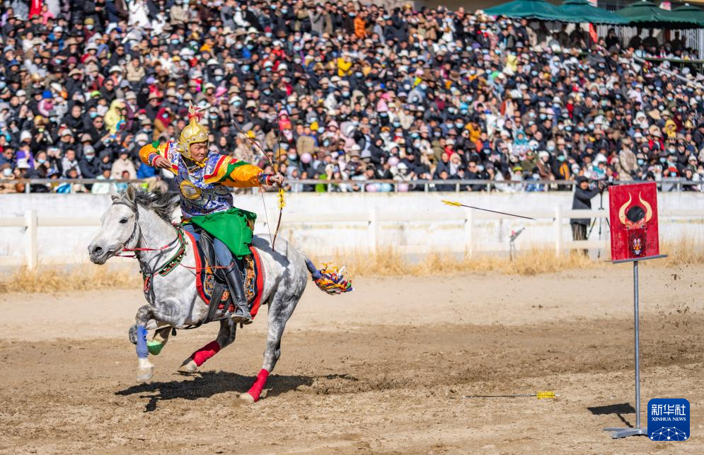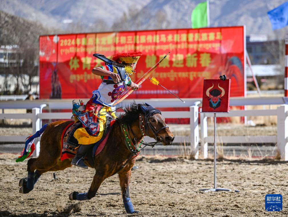 在拉薩賽馬場(chǎng),騎手表演馬上射箭(2月12日攝)。新華社記者 孫非 攝 ??