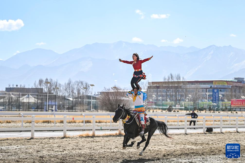 在拉薩賽馬場(chǎng),騎手進(jìn)行單馬雙人表演(2月12日攝)。新華社記者 孫瑞博 攝 ??