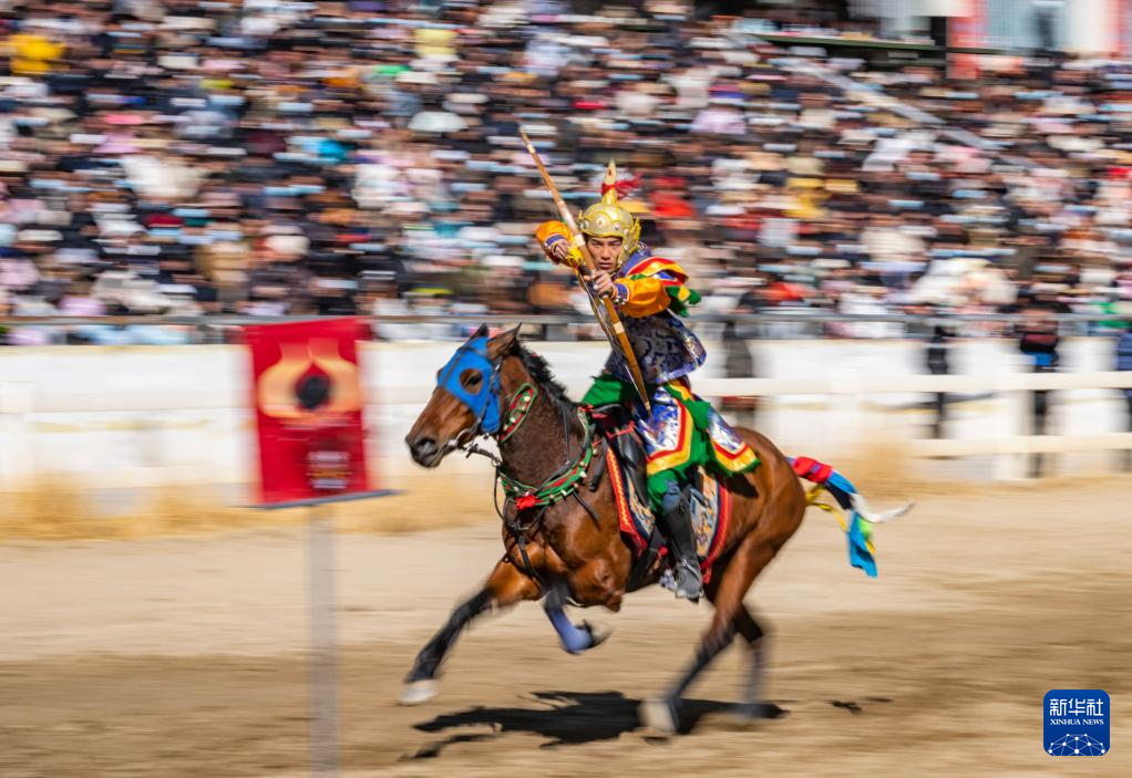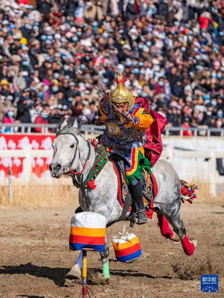 在拉薩賽馬場(chǎng),騎手表演馬上斬劈(2月12日攝)。新華社記者 孫非 攝 ??