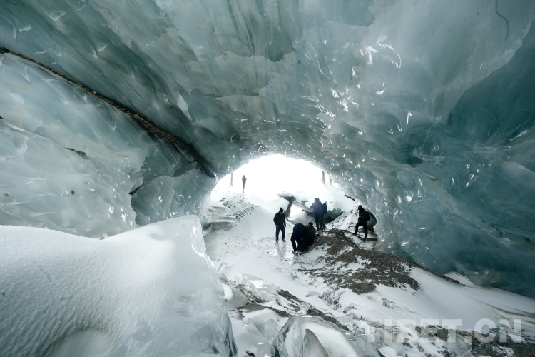 圖為工作人員在然普冰洞內(nèi)部進行勘測。攝影:斯郎曲平