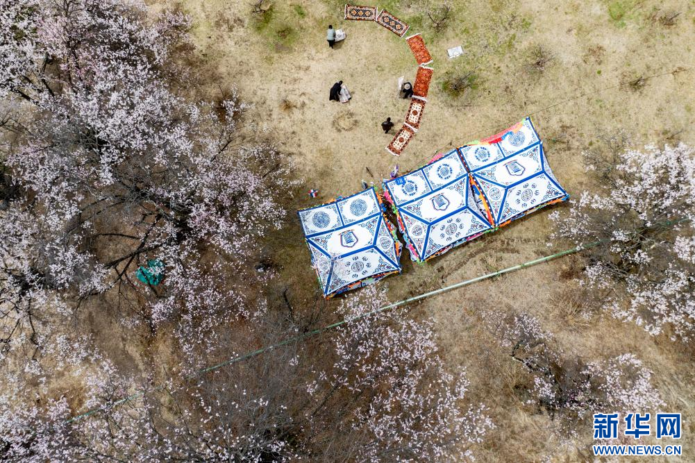 4月3日,群眾在林芝市巴宜區(qū)嘎拉村桃花間準(zhǔn)備 “過林卡”(無人機照片)。新華網(wǎng) 旦增努布 攝