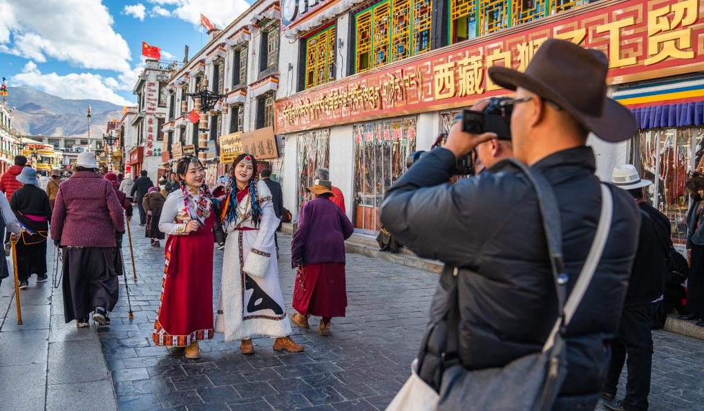 游客在八廓街街道上拍照留念。新華社記者 丁增尼達 攝