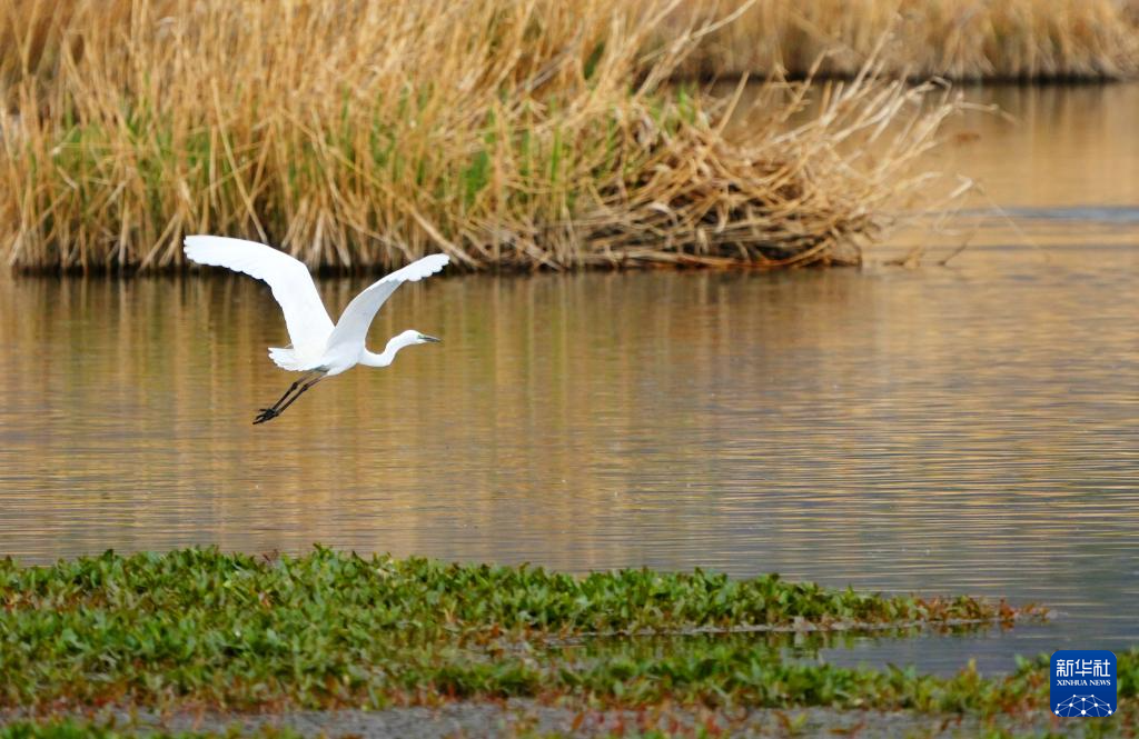 一只白鷺在拉魯濕地水面上飛翔(5月5日攝)。新華社記者 張汝鋒 攝