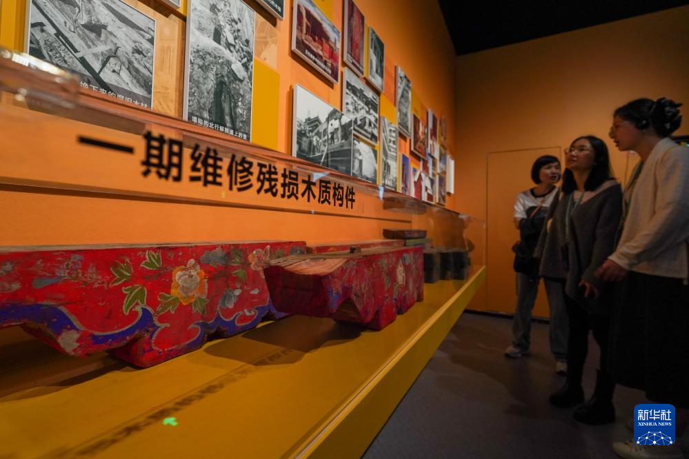 5月11日,觀眾在展出現(xiàn)場參觀布達(dá)拉宮一期維修殘損木質(zhì)構(gòu)件。新華社記者 李博 攝