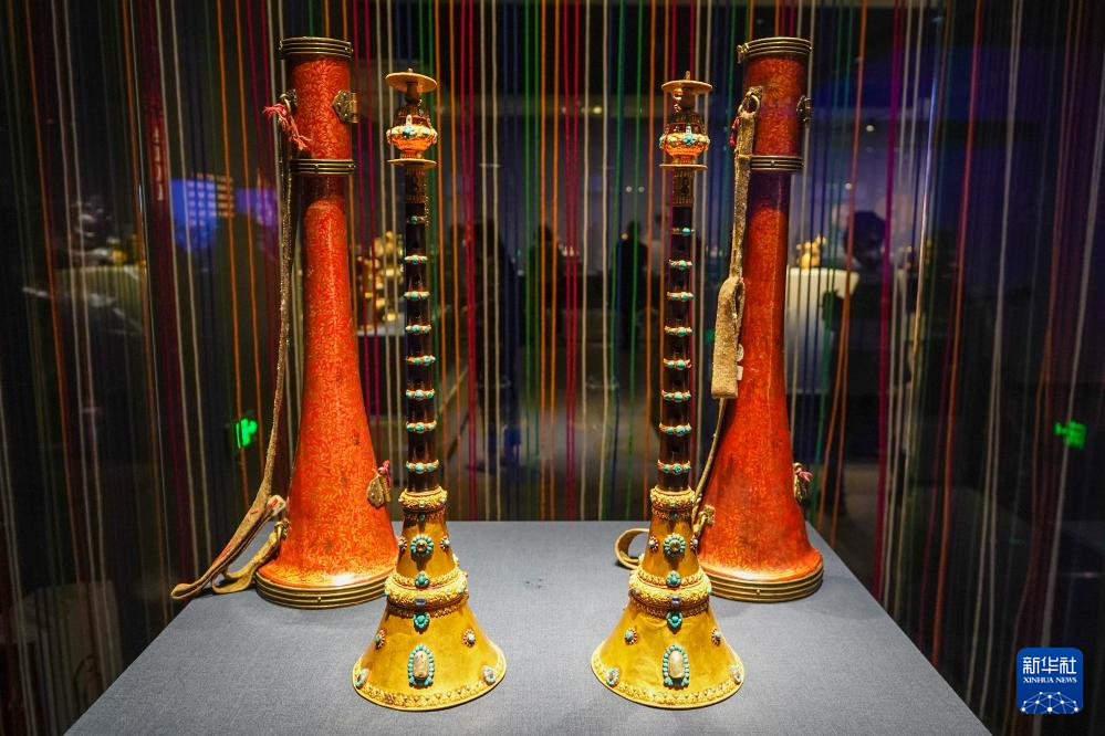 5月11日,“布達(dá)拉宮——來自雪域的世界文化遺產(chǎn)”展覽現(xiàn)場展出的“藏式嗩吶”。新華社記者 李博 攝