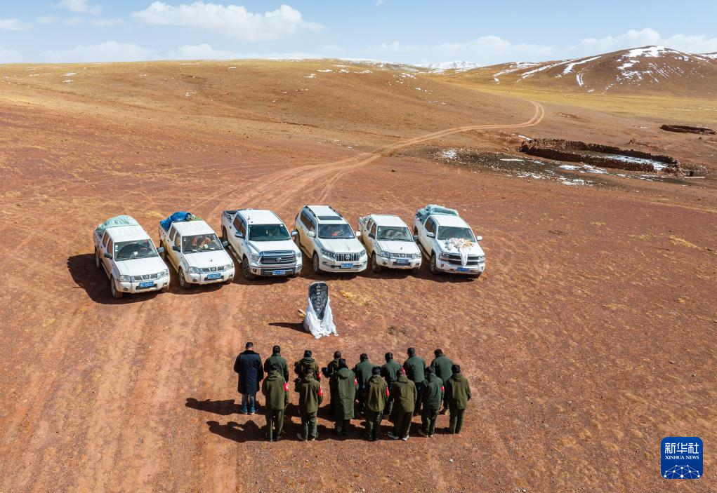 野生動物專業(yè)管護(hù)隊員在無人區(qū)深處的羅布玉杰烈士紀(jì)念碑前默哀致敬。羅布玉杰2002年在與盜獵分子的槍戰(zhàn)中犧牲(無人機(jī)照片,5月10日攝)。新華社記者 姜帆 攝