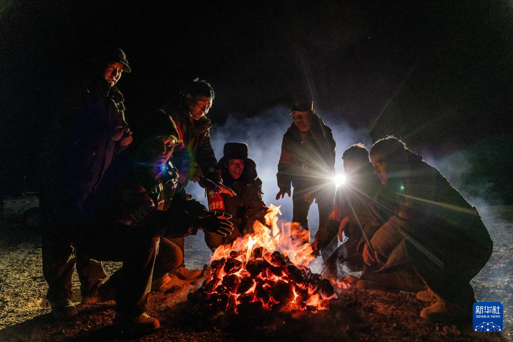 野生動物專業(yè)管護(hù)隊員在宿營地里烤火,燃料是野牦牛的糞便(5月10日攝)。新華社記者 丁增尼達(dá) 攝 ??