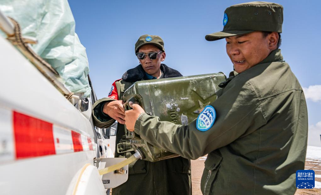 ??野生動物專業(yè)管護(hù)隊員在巡護(hù)途中給車輛加油(5月9日攝)。新華社記者 丁增尼達(dá) 攝