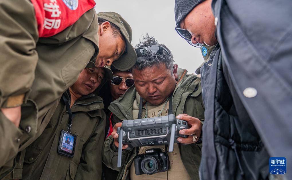 ??羅布玉杰管護(hù)站站長格桑倫珠(右二)和隊員們在大雪中操作無人機(jī)觀察藏羚羊遷徙情況(5月10日攝)。新華社記者 丁增尼達(dá) 攝