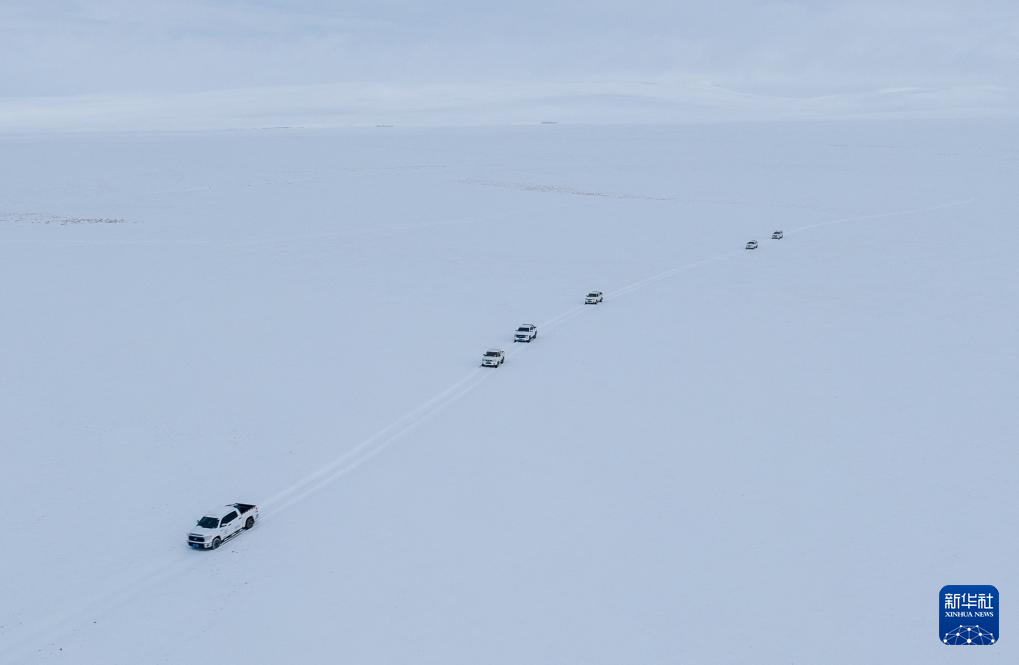 ??野生動物專業(yè)管護(hù)隊員的車隊在大雪中巡護(hù)(無人機(jī)照片,5月8日攝)。新華社記者 丁增尼達(dá) 攝